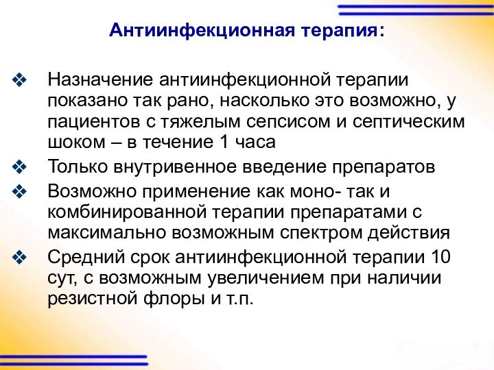 Средний срок антиинфекционной терапии 10 сут, с возможным увеличением при наличии резистной флоры и т.п.