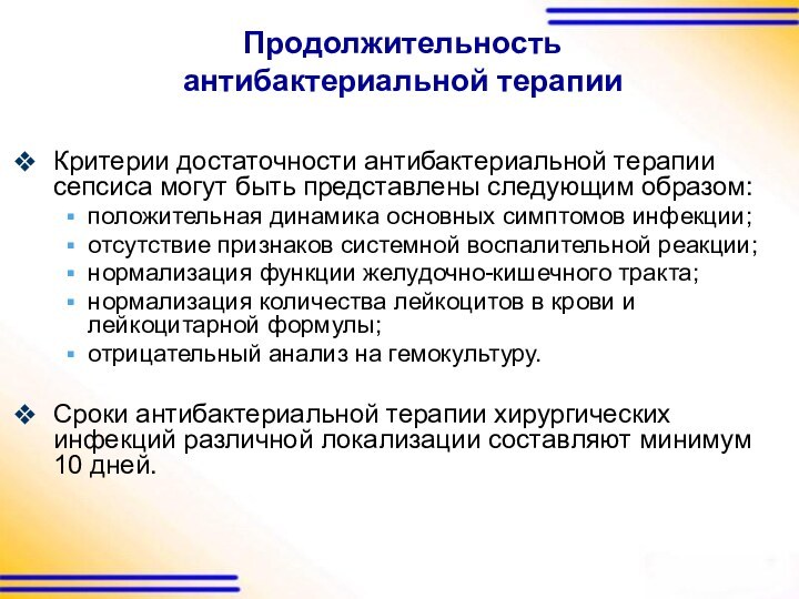 Сроки антибактериальной терапии хирургических инфекций различной локализации составляют минимум 10 дней.