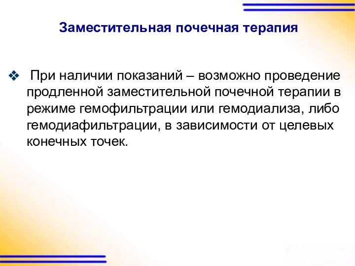 гемодиализа, либо гемодиафильтрации, в зависимости от целевых конечных точек.