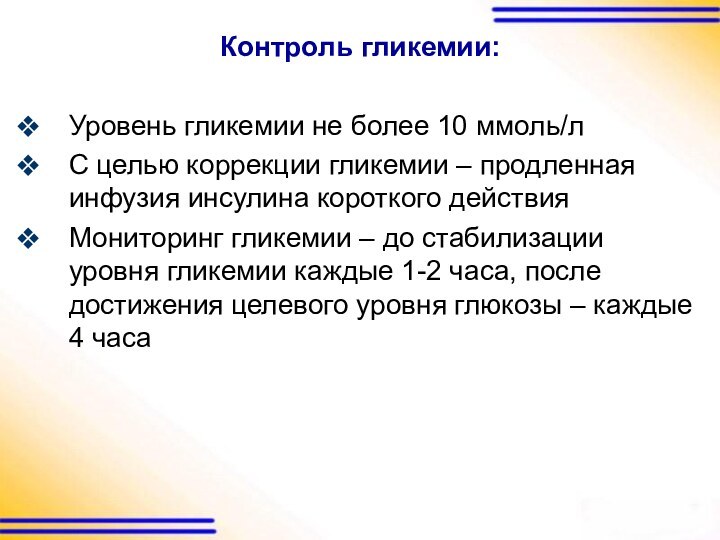 гликемии – до стабилизации уровня гликемии каждые 1-2 часа, после достижения целевого уровня глюкозы – каждые 4 часа