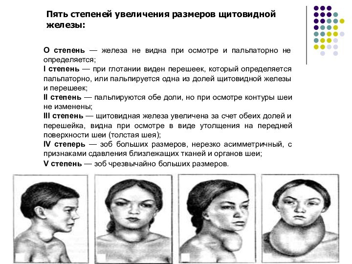 III степень — щитовидная железа увеличена за счет обеих долей и перешейка, видна при осмотре в виде утолщения на передней поверхности шеи (толстая шея);