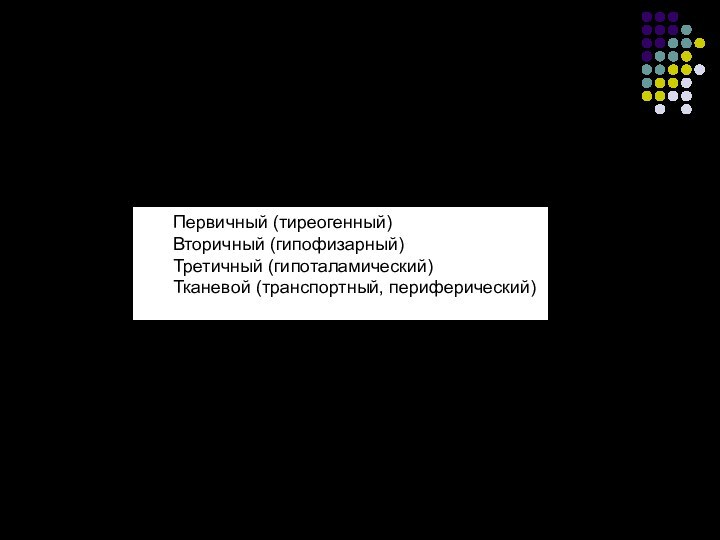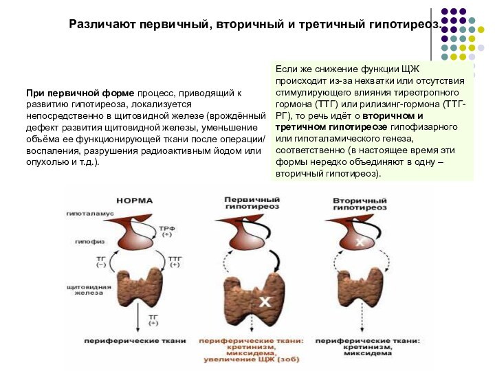 Если же снижение функции ЩЖ происходит из-за нехватки или отсутствия стимулирующего влияния тиреотропного гормона (ТТГ) или рилизинг-гормона (ТТГ-РГ), то речь идёт о вторичном и третичном гипотиреозе гипофизарного или гипоталамического генеза, соответственно (в настоящее время эти формы нередко объединяют в одну – вторичный гипотиреоз).