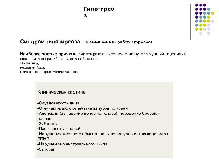 Синдром гипотиреоза – уменьшение выработки гормонов