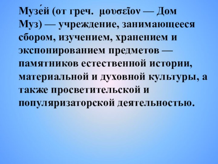 Слайд 2 Музе́й (от греч. μουσεῖον — Дом Муз) — учреждение, занимающееся сбором, изучением,