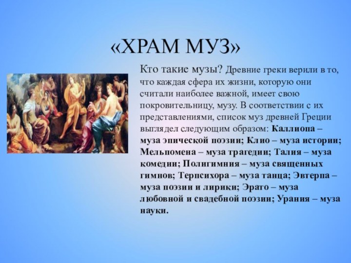 «ХРАМ МУЗ» Кто такие музы? Древние греки верили в