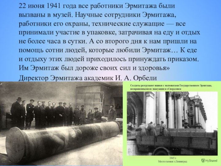 технические служащие — все принимали участие в упаковке, затрачивая на еду и отдых не более часа в сутки. А со второго дня к нам пришли на помощь сотни людей, которые любили Эрмитаж… К еде и отдыху этих людей приходилось принуждать приказом. Им Эрмитаж был дороже своих сил и здоровья» Директор Эрмитажа академик И. А. Орбели