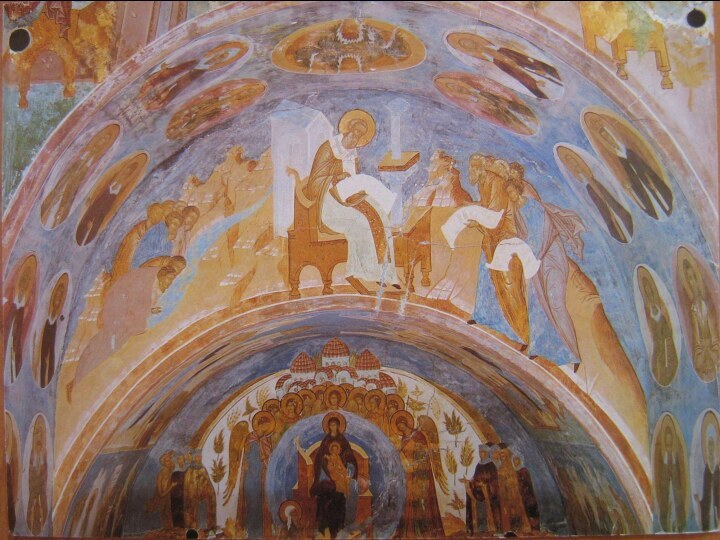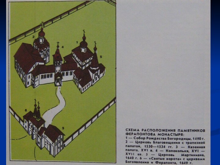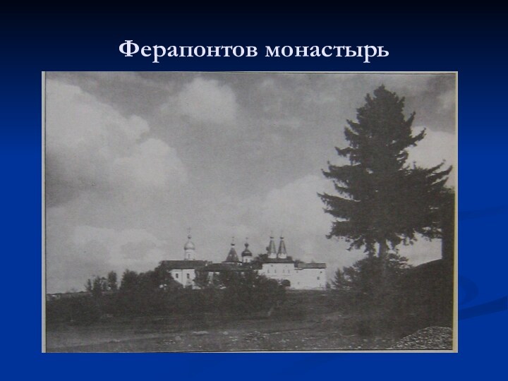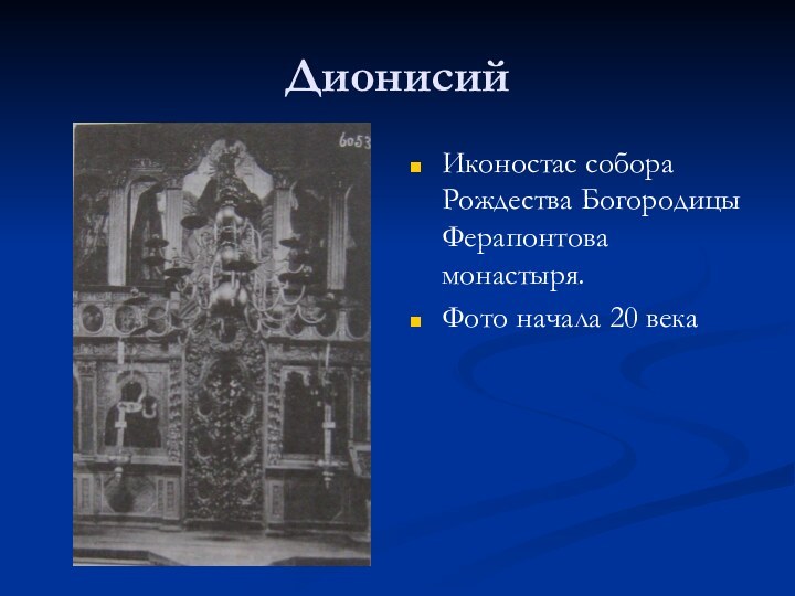 Росписи Дионисия в Ферапонтовом монастыреВыполнила Асалханова Е.В., преподаватель Усть-Ордынской Детской школы искусств Ферапонтов монастырь Храм Рождества Богородицы  Ферапонтова монастыря Портал собора Рождества Богородицы Дионисий Иконостас собора Рождества Богородицы Ферапонтова монастыря.Фото начала 20 века Дионисий Четыре зверя – символы четырех царств апокалипсиса