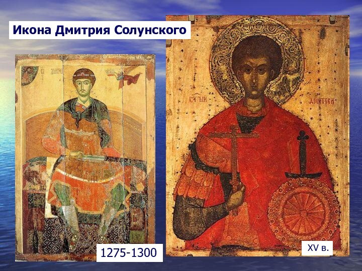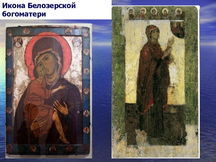 Иконопись в 12 - 13 веке «Деисус» Дата создания: XIII векМесторасположение: Санкт-Петербург, Русский МузейОколо 1551 г. Богоматерь Великая Панагия (Оранта Ярославска) Из Спасского монастыря в Ярославле. Икона Дмитрия Солунского1275-1300 XV в. икона Георгия конец XII в.– начало XIV в Репродукция иконы Икона Белозерской богоматери Апостолы Пётр и Павел. Икона середины XIII века.Богоматерь Печерская