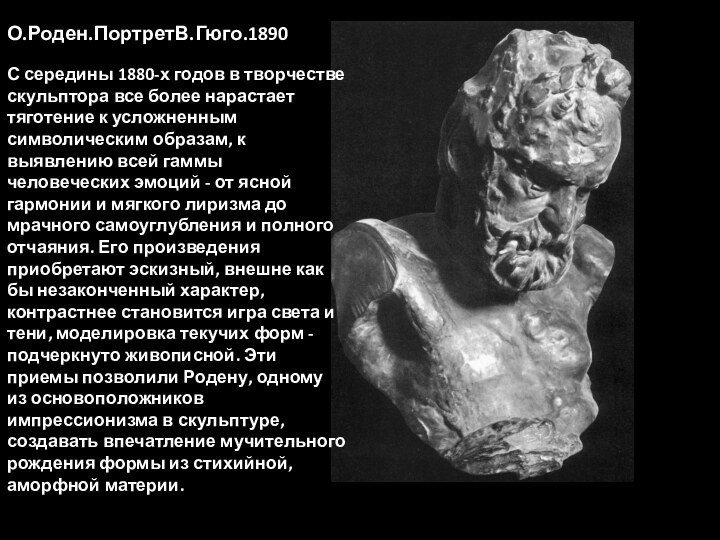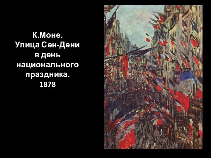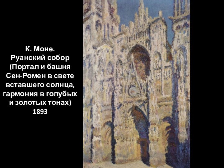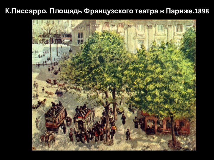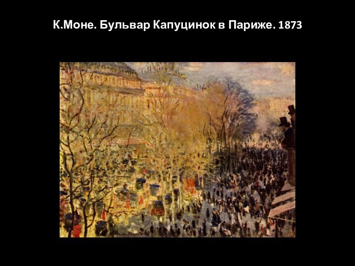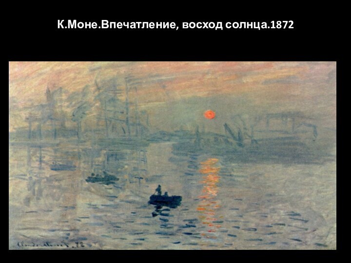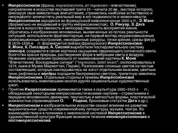 которого, фиксируя свои мимолетные впечатления, стремились наиболее естественно и непредвзято запечатлеть реальный мир в его подвижности и изменчивости. Импрессионизм зародился во французской живописи конце 1860-х гг.: Э. Мане (формально не входивший в группу импрессионистов), О. Ренуар, Э. Дега внесли в искусство свежесть и непосредственность восприятия жизни, обратились к изображению мгновенных, выхваченных из потока реальности ситуаций, использовали фрагментарные, на первый взгляд неуравновешенные композиционные построения, неожиданные ракурсы, точки зрения, срезы фигур. В 1870–1880-е гг. формируется пейзаж французского Импрессионизма: К. Моне, К. Писсарро, А. Сислей выработали последовательную систему пленэра, создавали в своих картинах ощущение сверкающего солнечного света, богатства красок природы, растворения форм в вибрации света и воздуха. Название направления произошло от наименования картины К. Моне "Впечатление. Восходящее солнце" ("Impression. Soleil levant"; экспонировалась в 1874, ныне в Музее Мармоттан, Париж). Разложение сложных цветов на чистые составляющие, которые накладывались на холст отдельными мазками, цветные тени, рефлексы и валёры породили беспримерно светлую, трепетную живопись Импрессионизма. Отдельные стороны и приемы Импрессионизма использовались живописцами многих других национальных художественных школ.Понятие Импрессионизм применяется также к скульптуре 1880–1910-х гг., обладающей некоторыми импрессионистическими чертами – стремлением к передаче мгновенного движения, текучестью и мягкостью формы, пластической эскизностью (произведения О. Родена, бронзовые статуэтки Дега и др.).