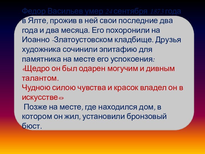 два месяца. Его похоронили на Иоанно -Златоустовском кладбище. Друзья художника сочинили эпитафию для памятника на месте его успокоения: