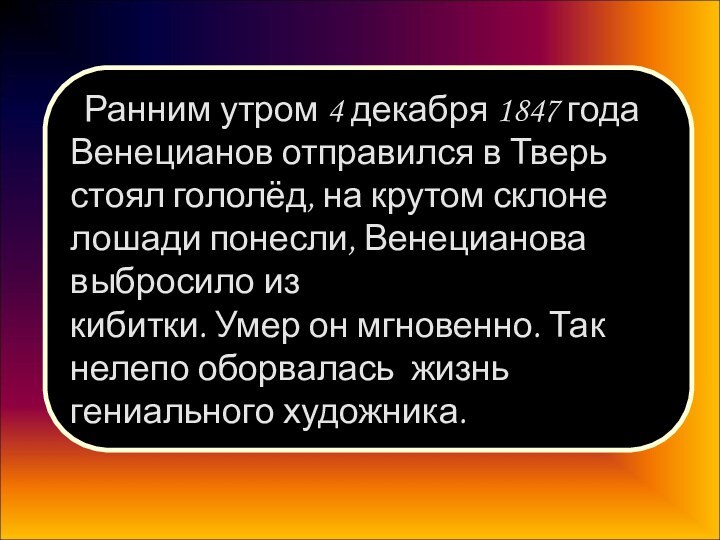 кибитки. Умер он мгновенно. Так нелепо оборвалась жизнь гениального художника.