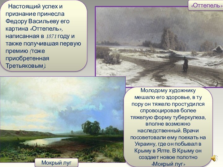 Молодому художнику мешало его здоровье, в ту пору он тяжело простудился спровоцировав более тяжелую форму туберкулеза, вполне возможно наследственный. Врачи посоветовали ему поехать на Украину, где он побывал в Крыму в Ялте. В Крыму он создает новое полотно «Мокрый луг»