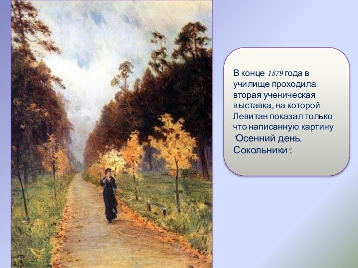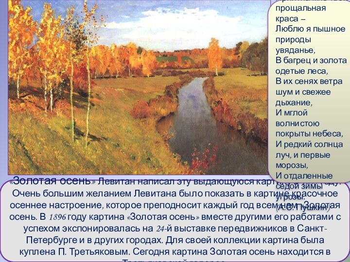 картине красочное осеннее настроение, которое преподносит каждый год всем нам «Золотая осень. В 1896 году картина «Золотая осень» вместе другими его работами с успехом экспонировалась на 24-й выставке передвижников в Санкт-Петербурге и в других городах. Для своей коллекции картина была куплена П. Третьяковым. Сегодня картина Золотая осень находится в Третьяковской галерее.
