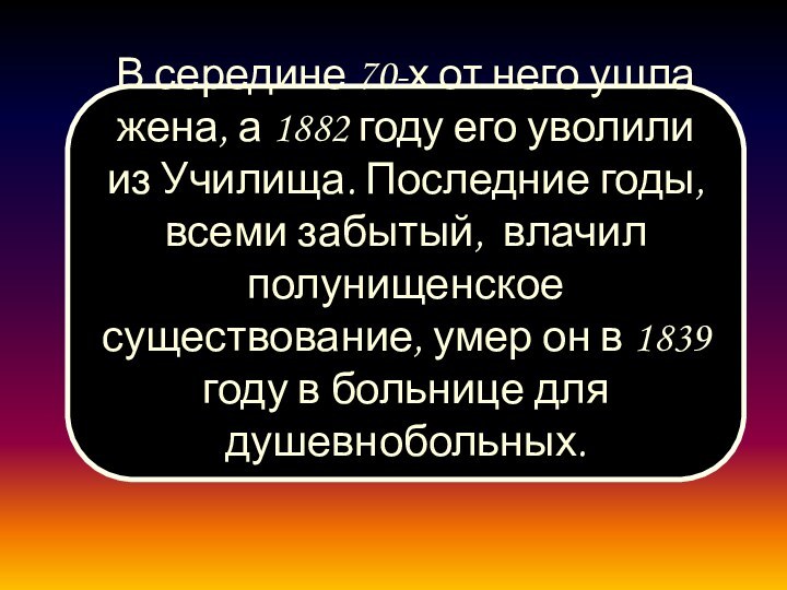 забытый, влачил полунищенское существование, умер он в 1839 году в больнице для душевнобольных.