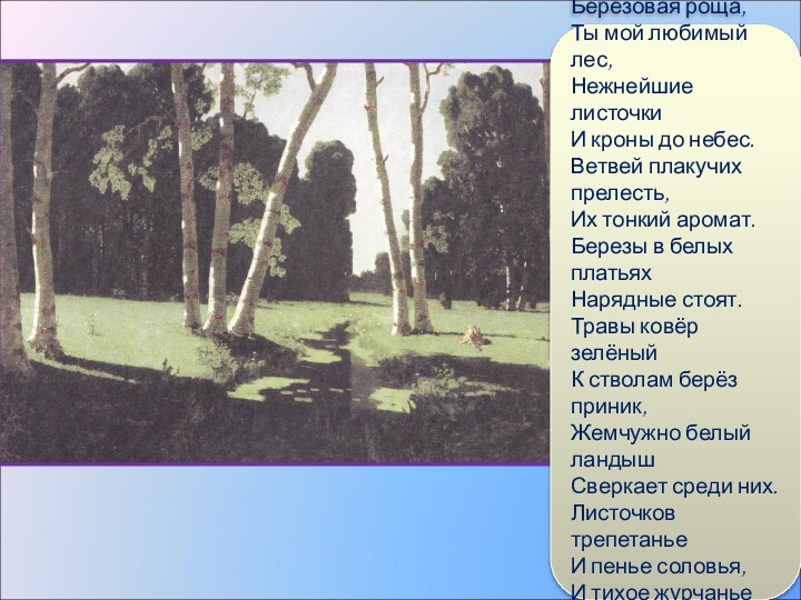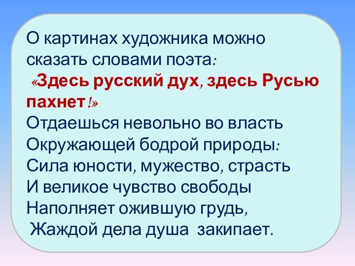 Картины И.Шишкина отличаются солнечностью, ясностью, радостью, раскрывают