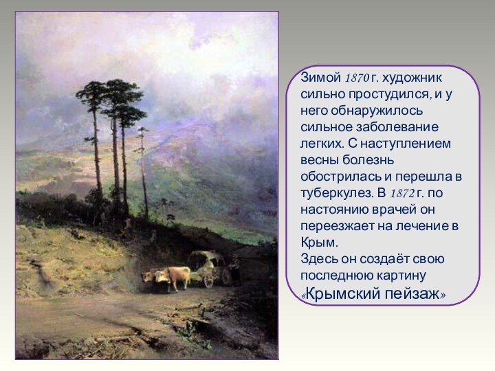 обострилась и перешла в туберкулез. В 1872 г. по настоянию врачей он переезжает на лечение в Крым.