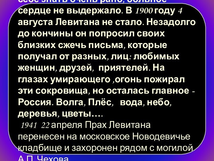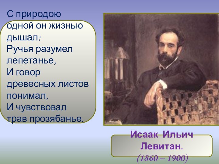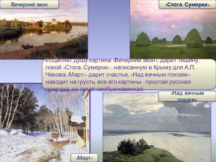 для А.П.Чехова.«Март»- дарит счастье, «Над вечным покоем» наводит на грусть, все его картины - простая русская природа, но такая необыкновенная.