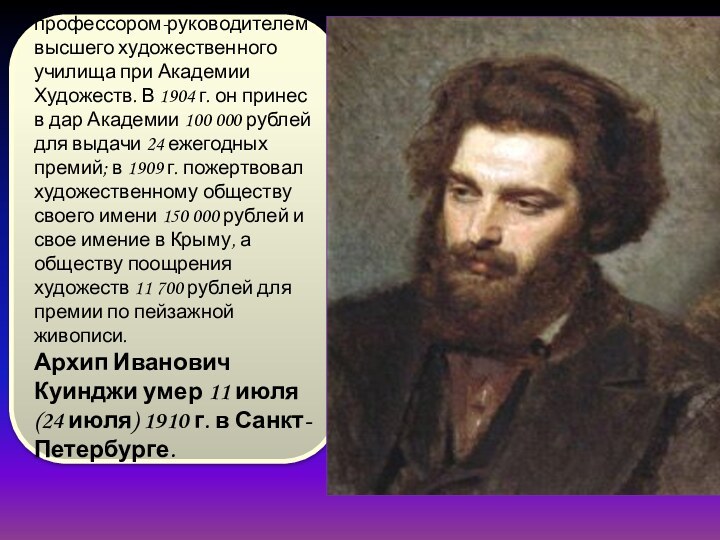 Архип Иванович Куинджи умер 11 июля (24 июля) 1910 г. в Санкт-Петербурге.