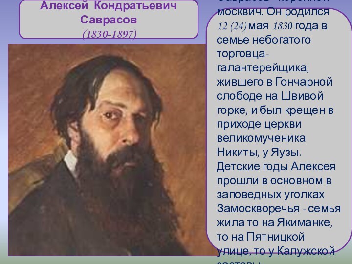 жившего в Гончарной слободе на Швивой горке, и был крещен в приходе церкви великомученика Никиты, у Яузы. Детские годы Алексея прошли в основном в заповедных уголках Замоскворечья - семья жила то на Якиманке, то на Пятницкой улице, то у Калужской заставы.