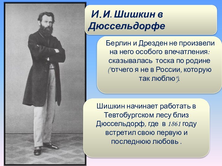 Шишкин начинает работать в Тевтобургском лесу близ Дюссельдорф, где в 1861 году встретил свою первую и последнюю любовь .