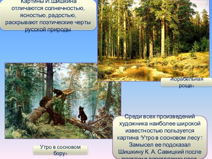 произведений художника наиболее широкой известностью пользуется картина "Утро в сосновом лесу". Замысел ее подсказал Шишкину К. А. Савицкий после поездки в вологодские леса.