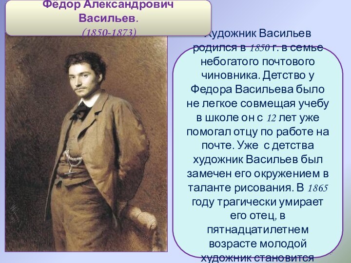 легкое совмещая учебу в школе он с 12 лет уже помогал отцу по работе на почте. Уже с детства художник Васильев был замечен его окружением в таланте рисования. В 1865 году трагически умирает его отец, в пятнадцатилетнем возрасте молодой художник становится опорой своей семьи.