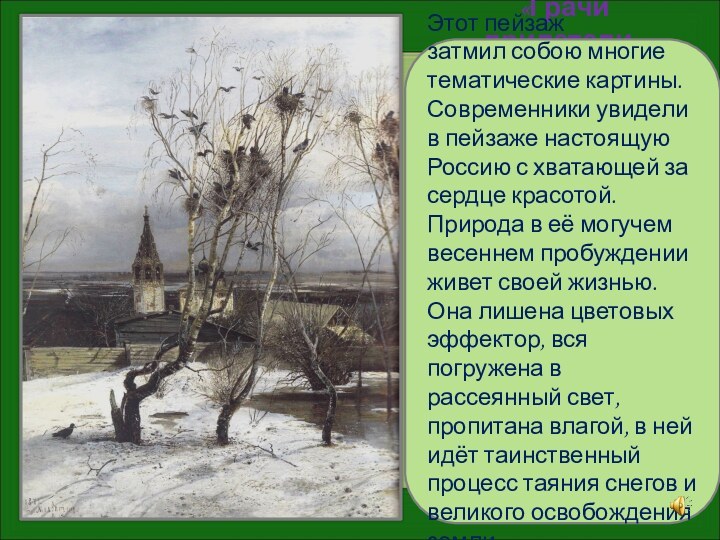 сердце красотой. Природа в её могучем весеннем пробуждении живет своей жизнью. Она лишена цветовых эффектор, вся погружена в рассеянный свет, пропитана влагой, в ней идёт таинственный процесс таяния снегов и великого освобождения земли.