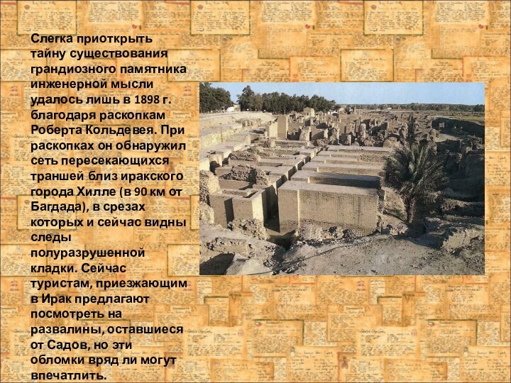 При раскопках он обнаружил сеть пересекающихся траншей близ иракского города Хилле (в 90 км от Багдада), в срезах которых и сейчас видны следы полуразрушенной кладки. Сейчас туристам, приезжающим в Ирак предлагают посмотреть на развалины, оставшиеся от Садов, но эти обломки вряд ли могут впечатлить.