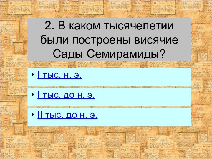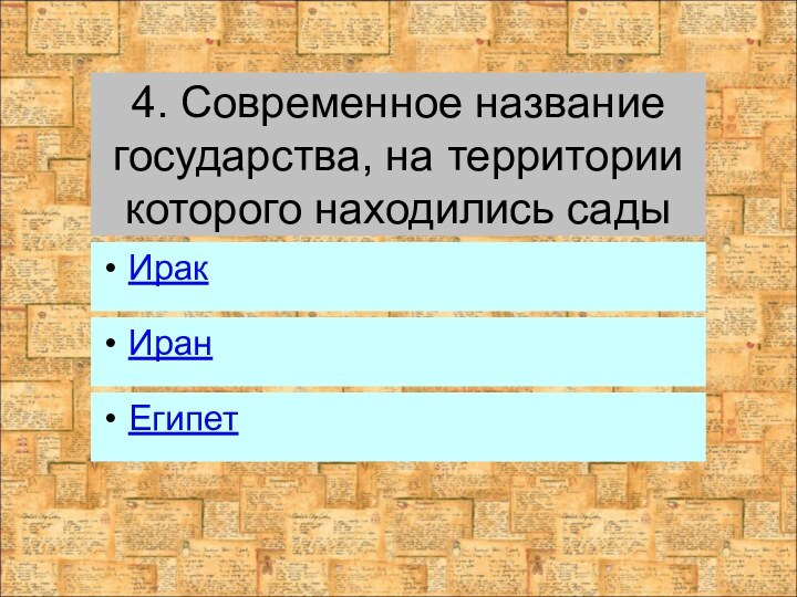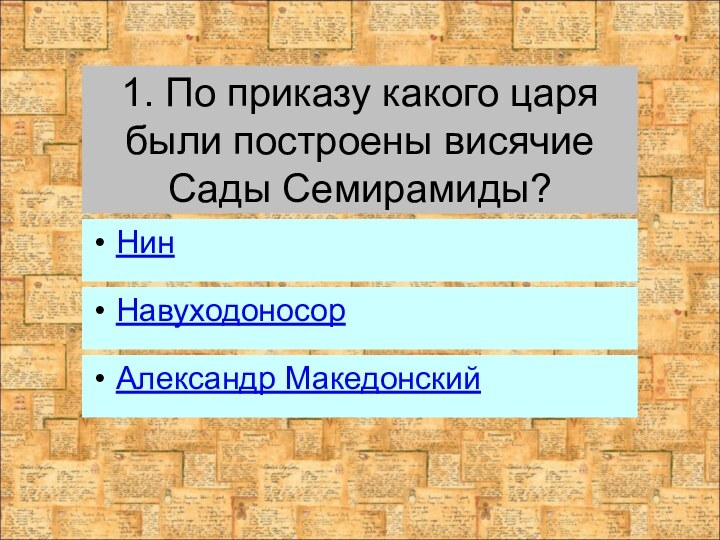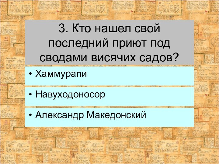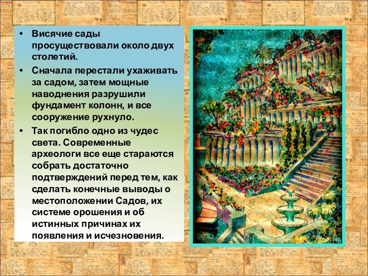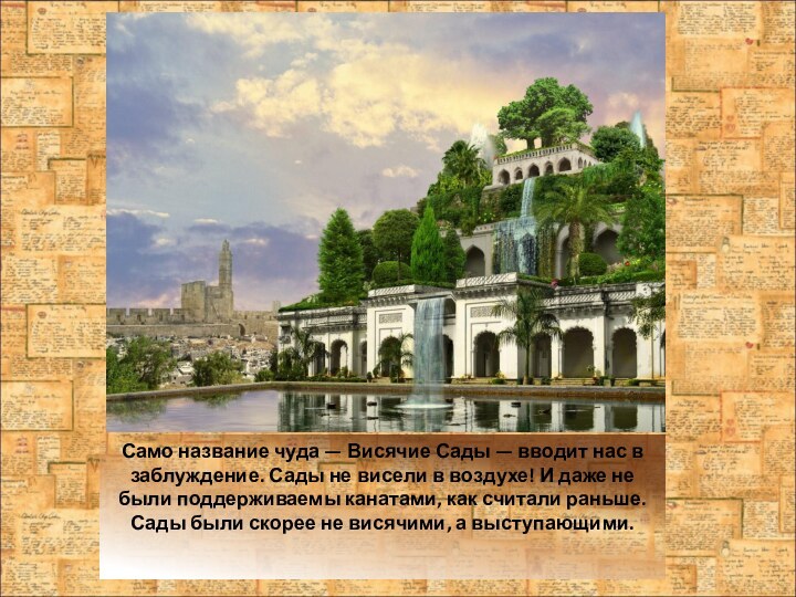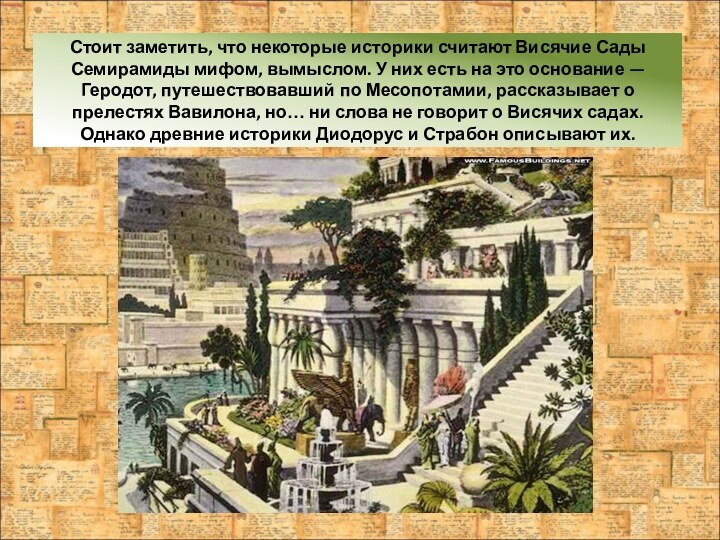 — Геродот, путешествовавший по Месопотамии, рассказывает о прелестях Вавилона, но… ни слова не говорит о Висячих садах. Однако древние историки Диодорус и Страбон описывают их.