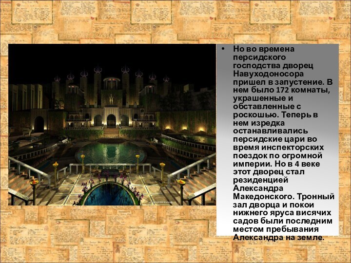 обставленные с роскошью. Теперь в нем изредка останавливались персидские цари во время инспекторских поездок по огромной империи. Но в 4 веке этот дворец стал резиденцией Александра Македонского. Тронный зал дворца и покои нижнего яруса висячих садов были последним местом пребывания Александра на земле.