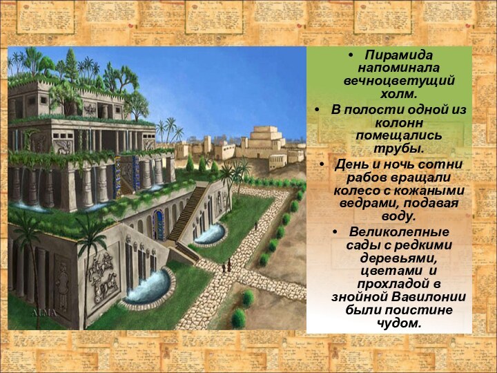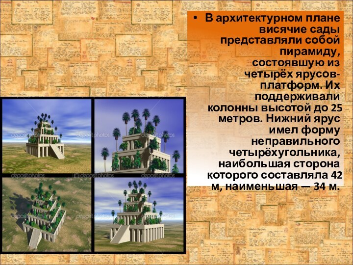 В архитектурном плане висячие сады представляли собой пирамиду,