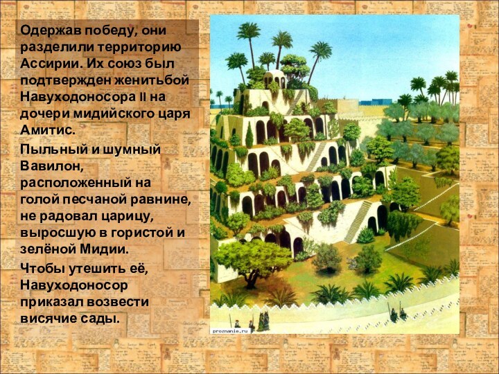 Одержав победу, они разделили территорию Ассирии. Их союз
