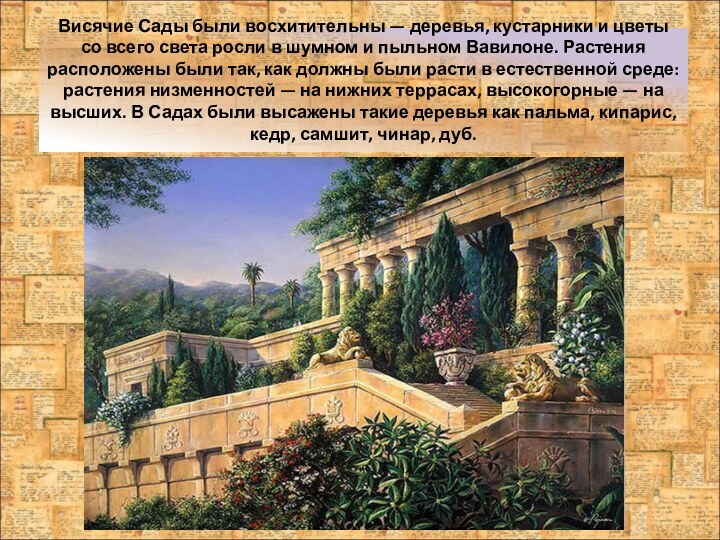 Вавилоне. Растения расположены были так, как должны были расти в естественной среде: растения низменностей — на нижних террасах, высокогорные — на высших. В Садах были высажены такие деревья как пальма, кипарис, кедр, самшит, чинар, дуб.
