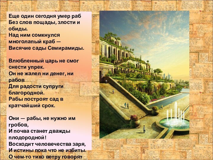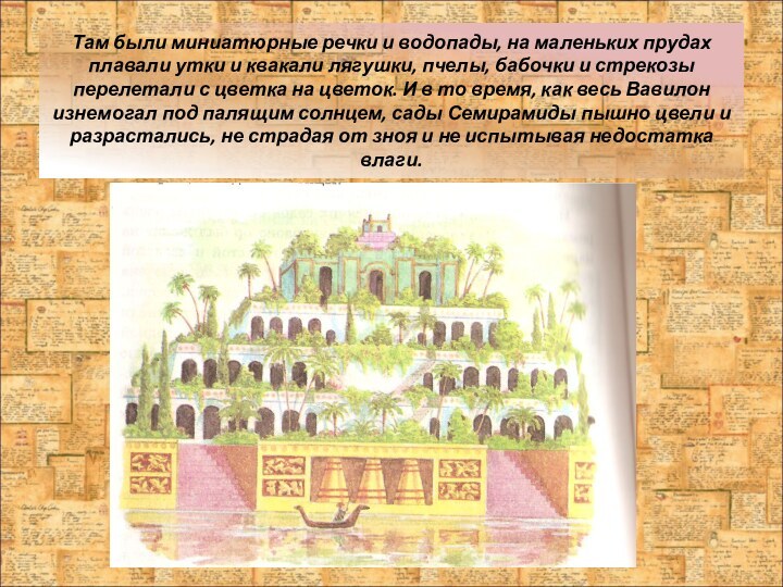 стрекозы перелетали с цветка на цветок. И в то время, как весь Вавилон изнемогал под палящим солнцем, сады Семирамиды пышно цвели и разрастались, не страдая от зноя и не испытывая недостатка влаги.