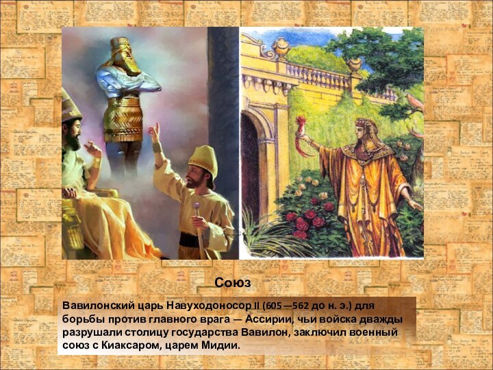 дважды разрушали столицу государства Вавилон, заключил военный союз с Киаксаром, царем Мидии.