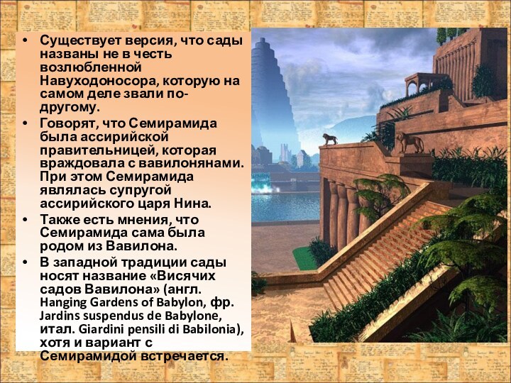 Также есть мнения, что Семирамида сама была родом из Вавилона.