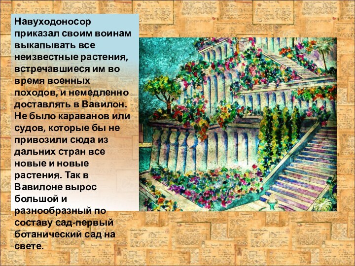 в Вавилон. Не было караванов или судов, которые бы не привозили сюда из дальних стран все новые и новые растения. Так в Вавилоне вырос большой и разнообразный по составу сад-первый ботанический сад на свете.