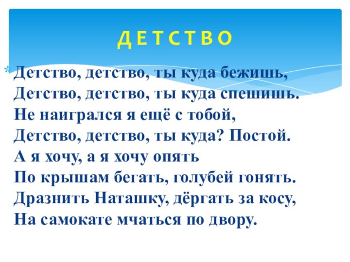 Постой. А я хочу, а я хочу опять По крышам бегать, голубей гонять. Дразнить Наташку, дёргать за косу, На самокате мчаться по двору.Д Е Т С Т В О