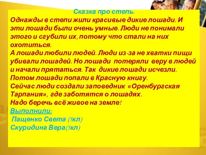 А лошади любили людей. Люди из-за не хватки пищи убивали лошадей. Но лошади потеряли веру в людей и начали прятаться. Так дикие лошади исчезли.