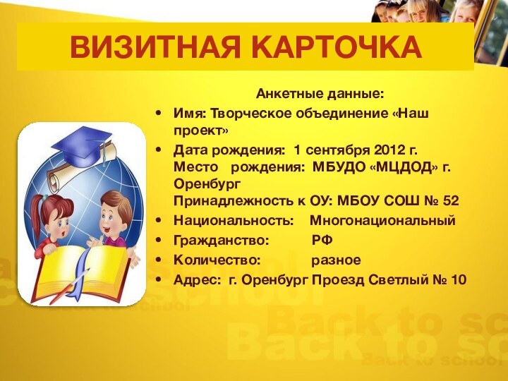 Место рождения: МБУДО «МЦДОД» г. Оренбург