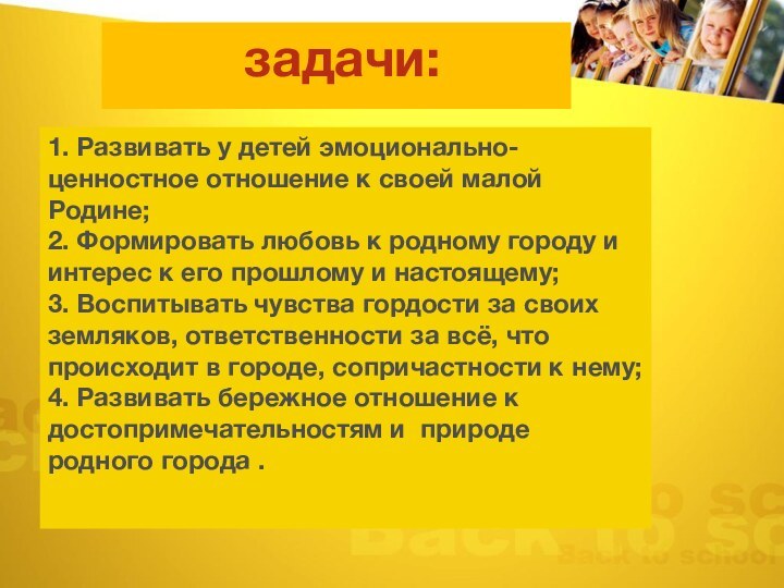 3. Воспитывать чувства гордости за своих земляков, ответственности за всё, что происходит в городе, сопричастности к нему;