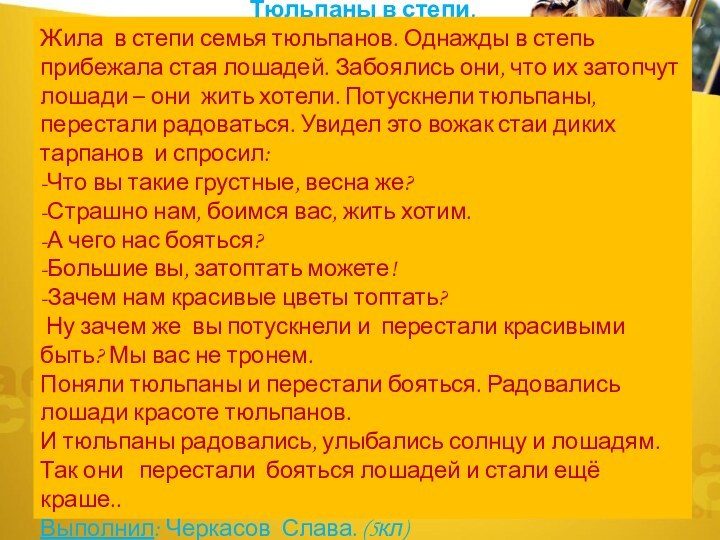 затопчут лошади – они жить хотели. Потускнели тюльпаны, перестали радоваться. Увидел это вожак стаи диких тарпанов и спросил: