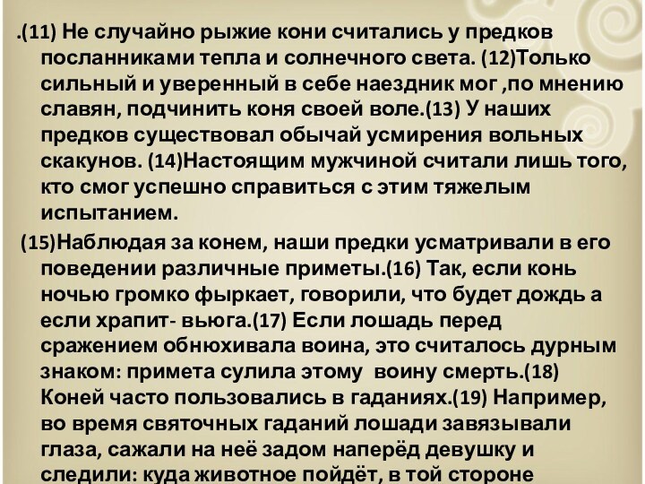 (15)Наблюдая за конем, наши предки усматривали в его поведении различные приметы.(16) Так, если конь ночью громко фыркает, говорили, что будет дождь а если храпит- вьюга.(17) Если лошадь перед сражением обнюхивала воина, это считалось дурным знаком: примета сулила этому воину смерть.(18) Коней часто пользовались в гаданиях.(19) Например, во время святочных гаданий лошади завязывали глаза, сажали на неё задом наперёд девушку и следили: куда животное пойдёт, в той стороне гадающая и найдёт своего суженого.