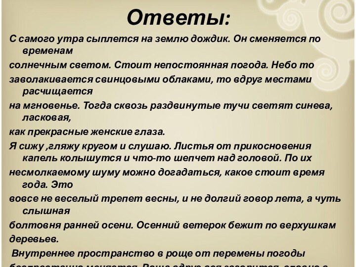 Я сижу ,гляжу кругом и слушаю. Листья от прикосновения капель колышутся и что-то шепчет над головой. По их