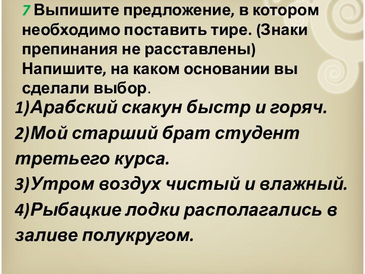 7 Выпишите предложение, в котором необходимо поставить тире.