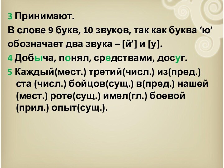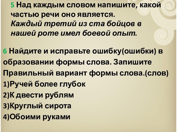 5 Каждый(мест.) третий(числ.) из(пред.) ста (числ.) бойцов(сущ.) в(пред.) нашей(мест.) роте(сущ.) имел(гл.) боевой(прил.) опыт(сущ.).