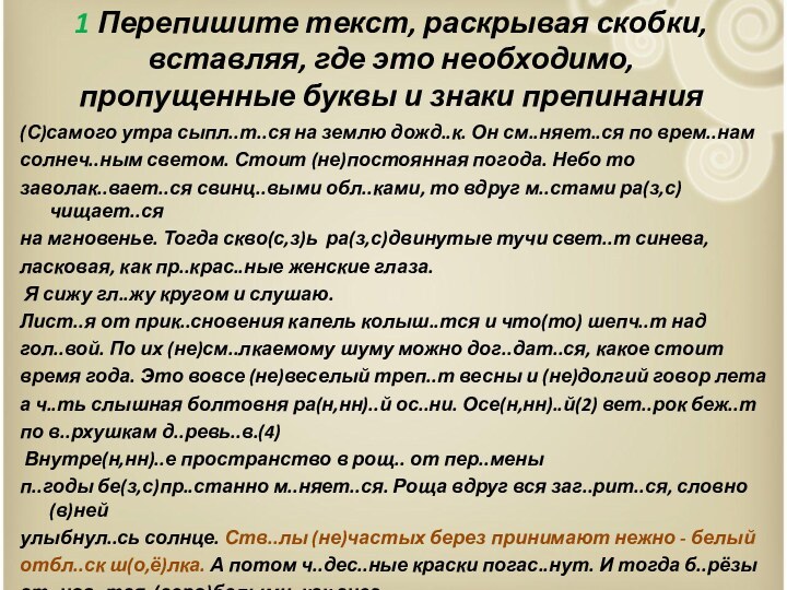 п..годы бе(з,с)пр..станно м..няет..ся. Роща вдруг вся заг..рит..ся, словно (в)ней