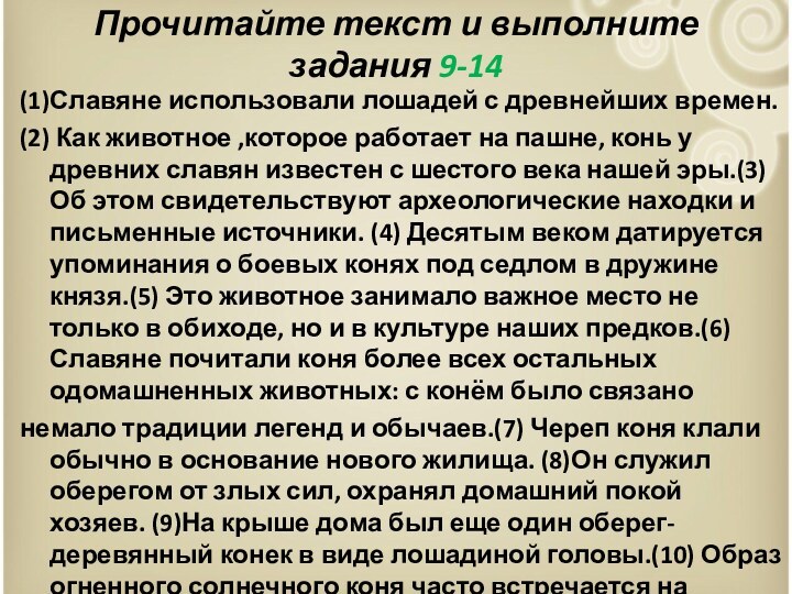 немало традиции легенд и обычаев.(7) Череп коня клали обычно в основание нового жилища. (8)Он служил оберегом от злых сил, охранял домашний покой хозяев. (9)На крыше дома был еще один оберег- деревянный конек в виде лошадиной головы.(10) Образ огненного солнечного коня часто встречается на древнерусских вышивках.