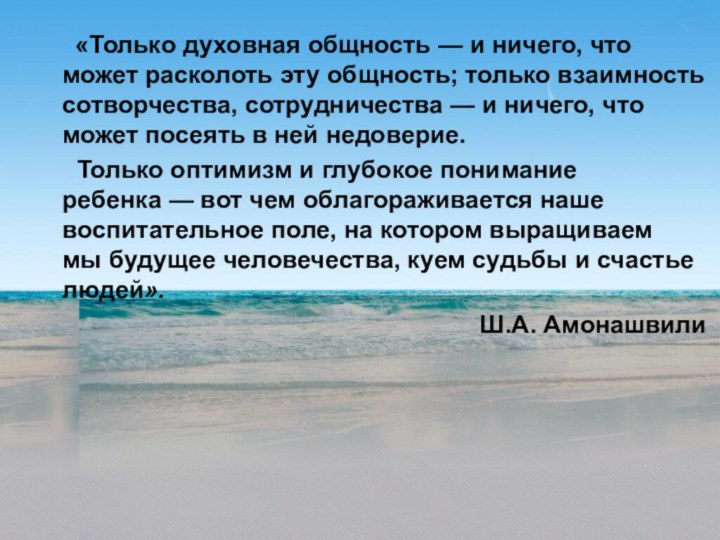 что может посеять в ней недоверие. Только оптимизм и глубокое понимание ребенка — вот чем облагораживается наше воспитательное поле, на котором выращиваем мы будущее человечества, куем судьбы и счастье людей». Ш.А. Амонашвили