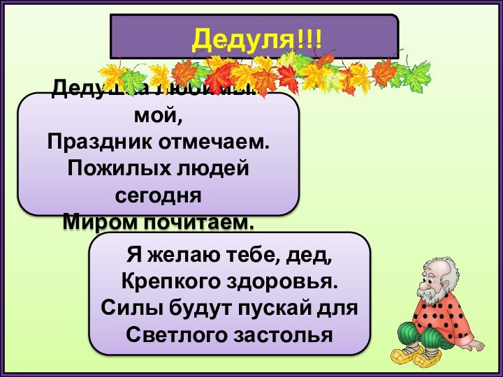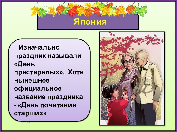 Изначально праздник называли «День престарелых». Хотя нынешнее официальное название праздника - «День почитания старших»